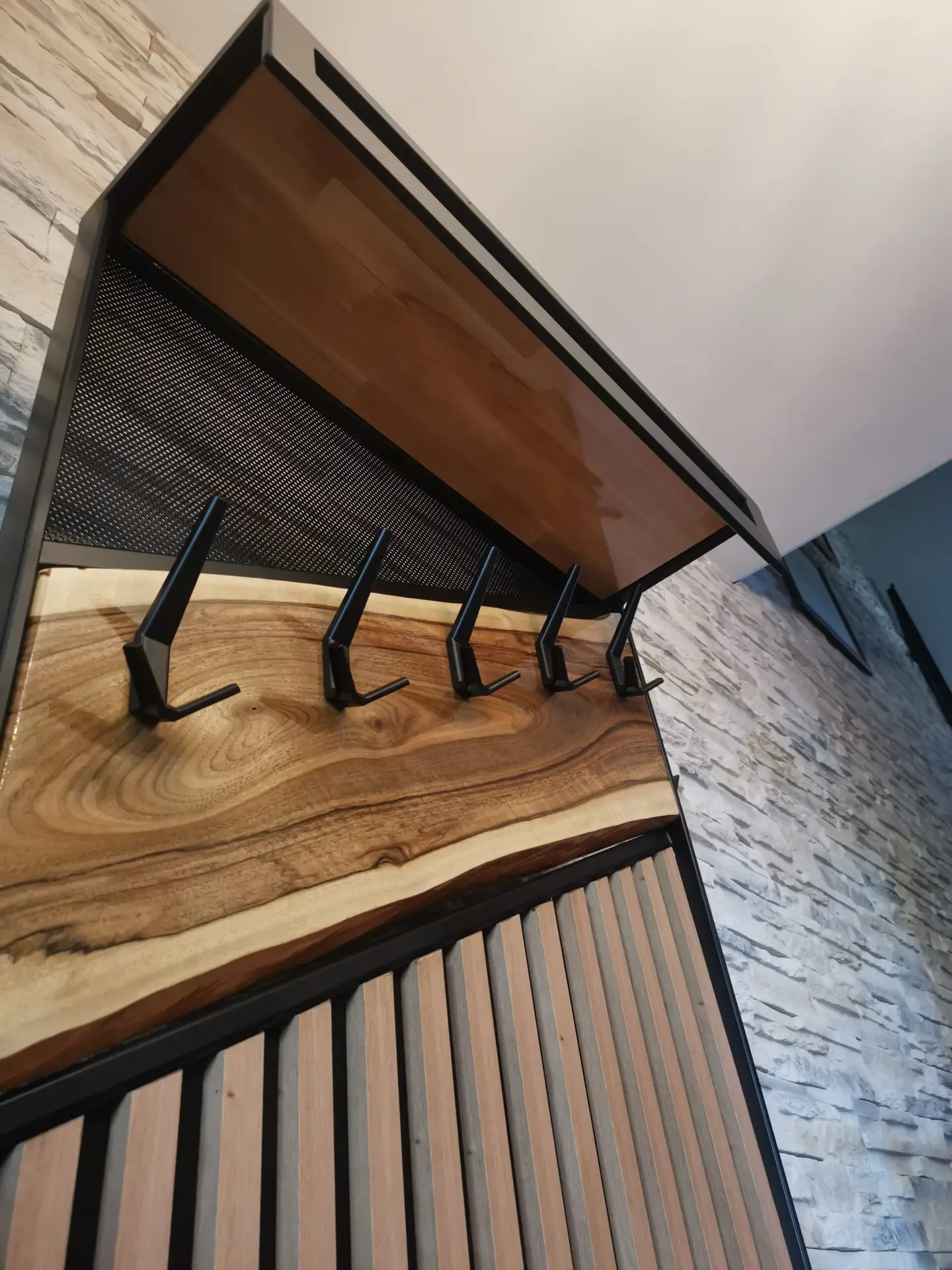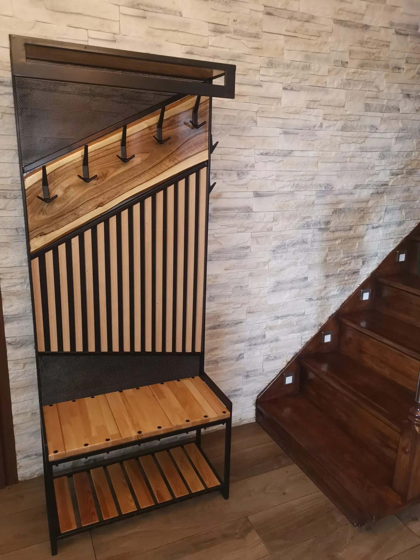 Loftowy wieszak “Steel Wood” to rękodzieło łączące różnorodne profile zamknięte z poprzeczną deską z orzecha włoskiego. Górna półka i siedzisko z buku, dolna półka z lameli sosnowych oraz centralne lamele dębowe z siatką perforowaną tworzą wyjątkowy design w stylu loftowym.